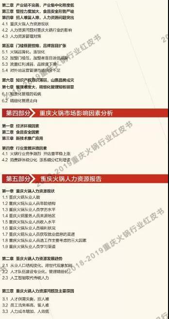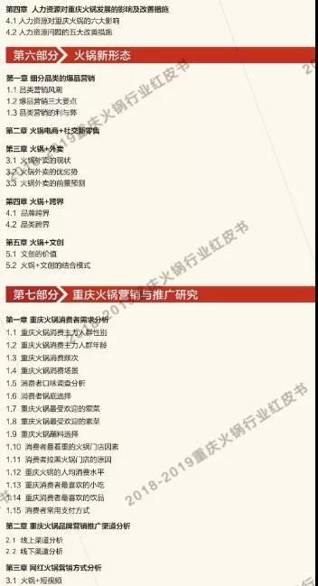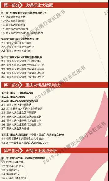 讓火鍋行業(yè)從業(yè)者更深入的了解重慶火鍋市場,讓重慶火鍋文化傳揚(yáng)全世界,是我們所一直倡導(dǎo)的?!吨貞c火鍋紅皮書》根據(jù)大眾點(diǎn)評和美團(tuán)網(wǎng)的數(shù)據(jù)收集,及對對重慶主城九區(qū)餐飲(火鍋)市場進(jìn)行了摸底式調(diào)研,分析餐飲(火鍋)類商戶的相關(guān)數(shù)據(jù)得出結(jié)果,為學(xué)習(xí)交流之目的,我們特將目錄公布如下以供試閱。